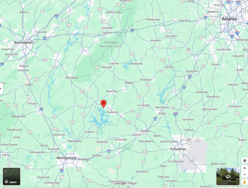 From Montgomery, AL, take Lower Wetumpka Rd approximately 8 miles and turn left onto US-231 North and follow for about another 8 miles. Keep right to continue on AL-170 East for about 12 miles. Continue onto AL-63 North for approximately 18 miles. Turn right onto AL-128 E (Coven Abbett Hwy) and then turn right onto US Hwy 280 East to County Rd 40 (Sturdivant Rd). *See above.